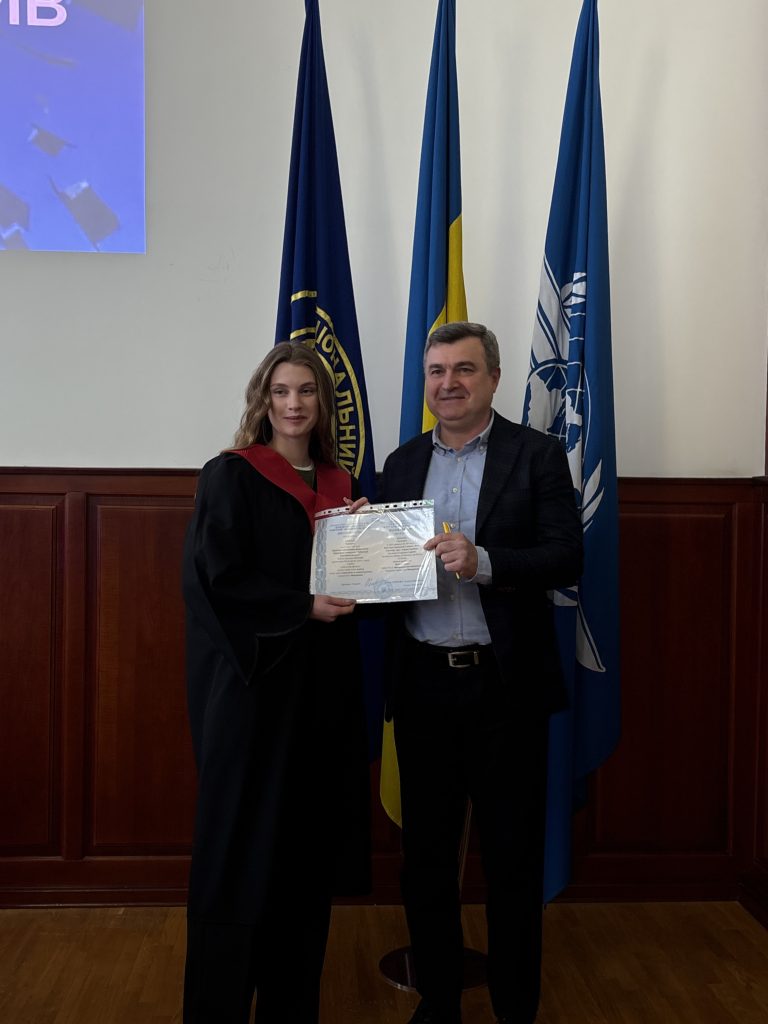 Анна Загоруйко, керівниця напряму персоналу та організаційного розвитку міжнародної транспортно-логістичної компанії DB Schenker в Україні, вручила дипломи випускникам освітньо-професійної програми «Логістика».