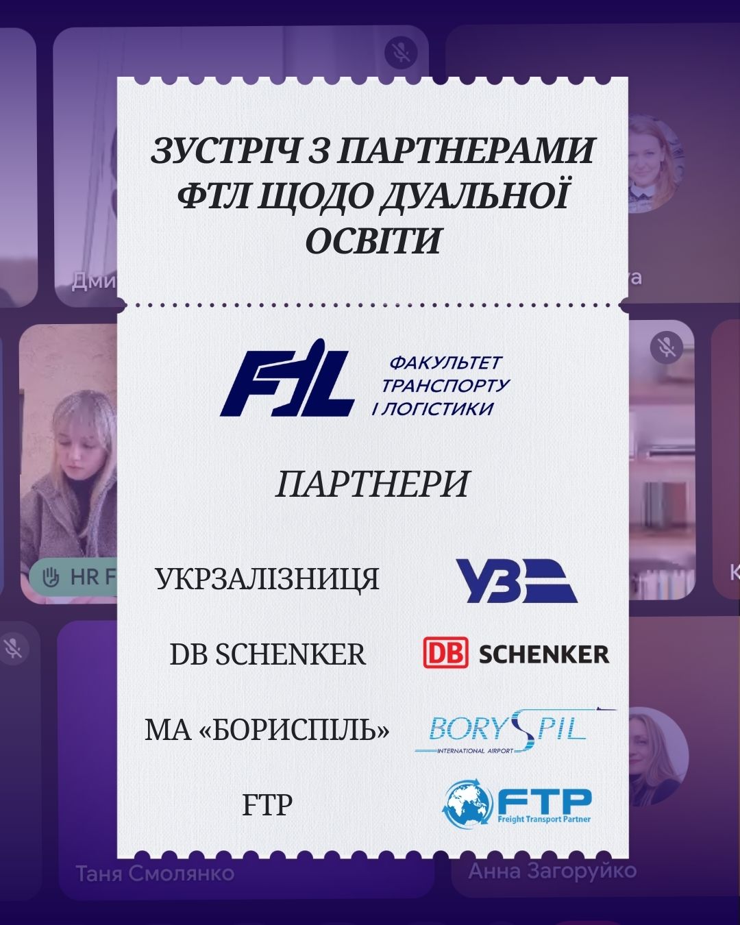У зустрічі взяли участь представники: Укрзалізниця — керівниця проєктів роботи з молоддю Тетяна Смолянко; DB Schenker — директор компанії Юлія Аглічанова та керівниця відділу персоналу Анна Загоруйко; Міжнародний аеропорт «Бориспіль» — заступник комерційного директора Євгеній Бєлік; FTP — HR-директор компанії Вікторія Шишова.